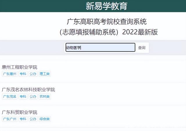 在新易学教育高职高考院校专业查询系统,搜索查询发现,在3+证书高职高考中,开办动物医学的院校有三所:惠州工程职业学院、广东茂名农林科技职业学院、广东科贸职业学院。