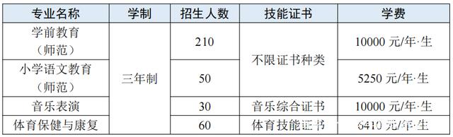 首批开设具有教师教育特色的学前教育、小学语文教育2个专业和体育保健与康复、音乐表演两个非师专业,均面向3+证书高职高考招生。